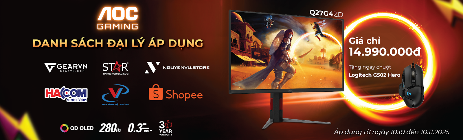 Nhân dịp màn hình QD-OLED Q27G4ZD trình làng tại thị trường Việt Nam, AOC mang đến khuyến mãi siêu hấp dẫn cho người dùng. Từ 10.10.2025 đến 10.11.2025, khi khách hàng mua màn hình tại các đại lý phân phối chính thức của AOC có trong danh sách sẽ nhận ngay chuột gaming Logitech G502 Hero trị giá 1.000.000đ