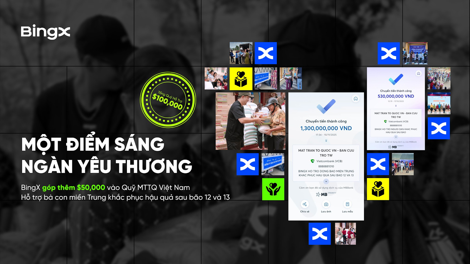 Trước tình hình mưa lũ đang gây ảnh hưởng nặng nề tại miền Trung, BingX Charity thông báo nâng tổng ngân sách cho chiến dịch “Một điểm sáng, ngàn yêu thương” lên tới 200,000 USD (khoảng hơn 5 tỷ đồng). Quyết định tăng quỹ được đưa ra ngay khi nhiều khu vực tại Khánh Hòa, Phú Yên và Đắk Lắk bị chia cắt do sạt lở và ngập sâu, khiến công tác cứu trợ gặp nhiều hạn chế.