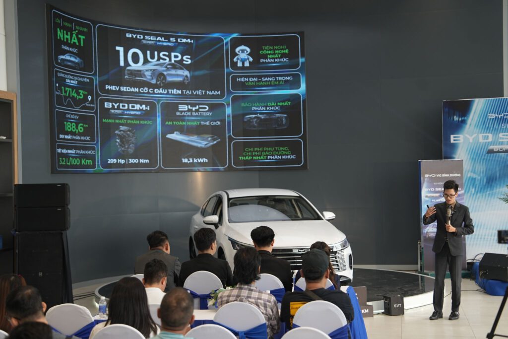 MC: Sáng nay, tại Showroom BYD Bình Dương – Showroom có quy mô lớn của BYD tại Thành phố Hồ Chí Minh đã chính thức ra mắt mẫu xe BYD SEAL 5 DM-i với chủ đề “Nội lực kiên định – Khí chất tiên phong.” Đây một biểu tượng mới trong ngành ô tô, là dấu mốc quan trọng trong hành trình phát triển của BYD tại Việt Nam.