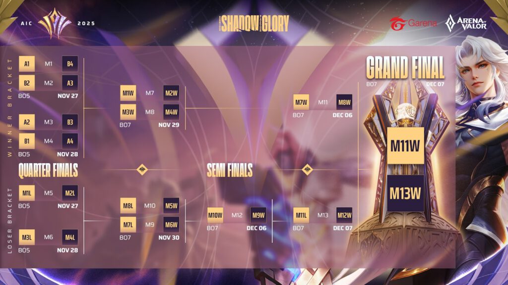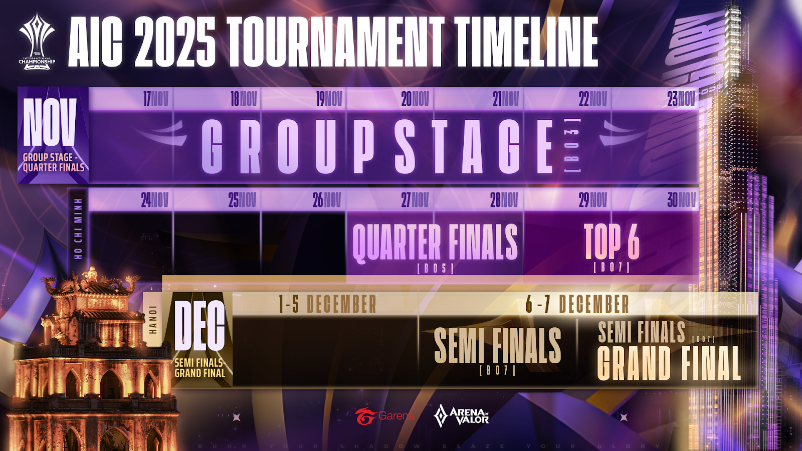 Giải đấu sẽ khép lại bằng Bán kết và Chung kết trực tiếp tại Hà Nội vào ngày 06 và 07/12. 4 đội mạnh nhất sẽ tranh tài trong các trận BO7 để xác định nhà vô địch AIC 2025.
