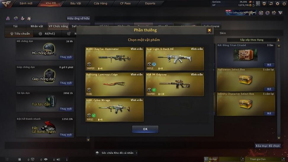 - Hòm Tùy Chọn vũ khí VIP:Cheytac M200 Dominator, G36C-Cyber Mirage, Scar Light-S Bạch Hổ, Balisong-Luminous Edge, VSK-94-Odyssey.