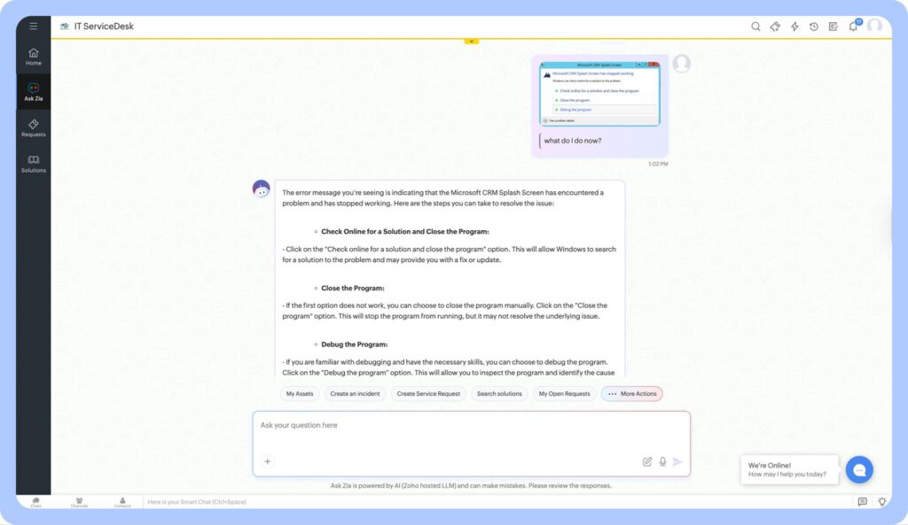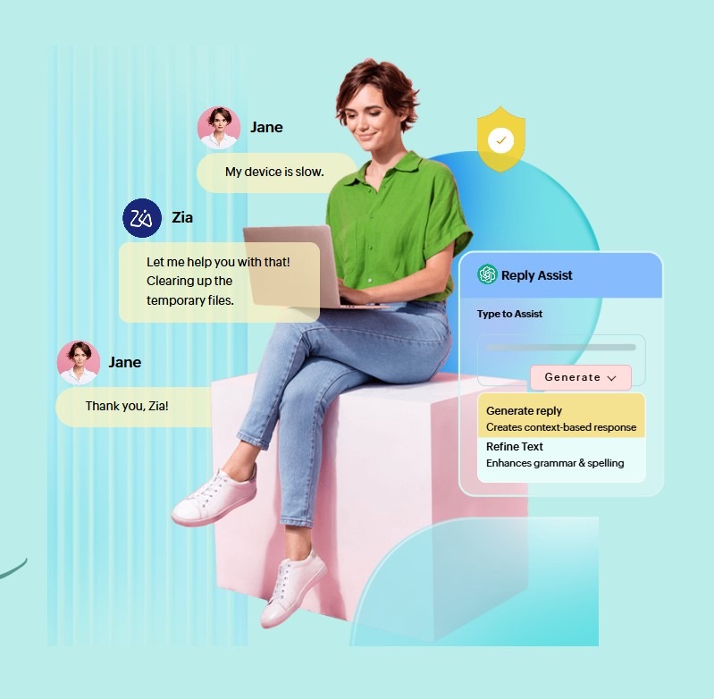 - Ask Zia: Giờ đây, được tăng cường sức mạnh bởi GenAI, trợ lý ảo Ask Zia đã có giao diện theo phong cách mô hình ngôn ngữ lớn cùng khả năng hỗ trợ đa phương thức. Điều này cho phép người dùng cuối, kỹ thuật viên và người phụ trách quy trình hoàn thành công việc thông qua tương tác đàm thoại. Trợ lý ảo này có thể cung cấp câu trả lời tức thì, thực hiện tìm kiếm trên toàn bộ hệ thống dịch vụ, trích xuất và tóm tắt các bài viết trong cơ sở kiến thức, và xử lý các thao tác liên quan đến yêu cầu – đóng vai trò như điểm tương tác chính cho mọi đối tượng người dùng.