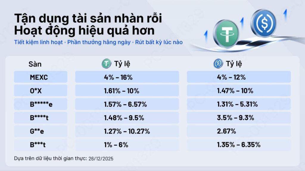 Dựa trên dữ liệu cập nhật mới nhất, MEXC tiếp tục giữ vững vị thế dẫn đầu về hiệu suất sinh lời cho các tài sản stablecoin. So với mặt bằng chung của các sàn giao dịch hiện nay, mức lãi suất tại MEXC Earn được đánh giá là vô cùng hấp dẫn: